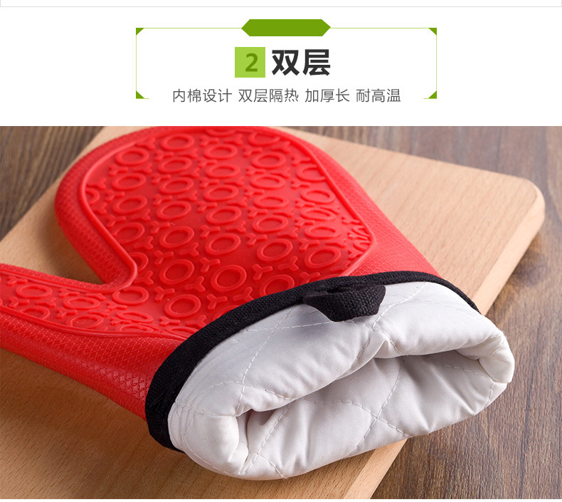 包裝:單只裝開口PP袋新款加長加厚雙層防燙硅膠手套,采用棉布加硅膠雙層防燙設計,棉布部分可以加印logo,雙層設計更加耐熱,該手套具有清洗方便、多重防滑、雙層耐熱、防水耐用等優勢。