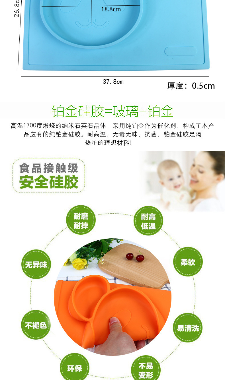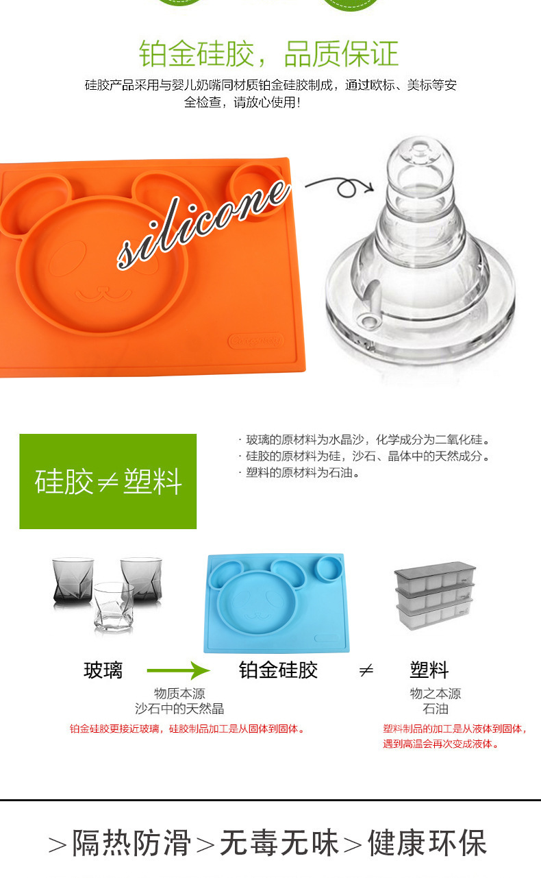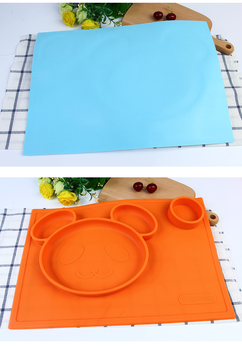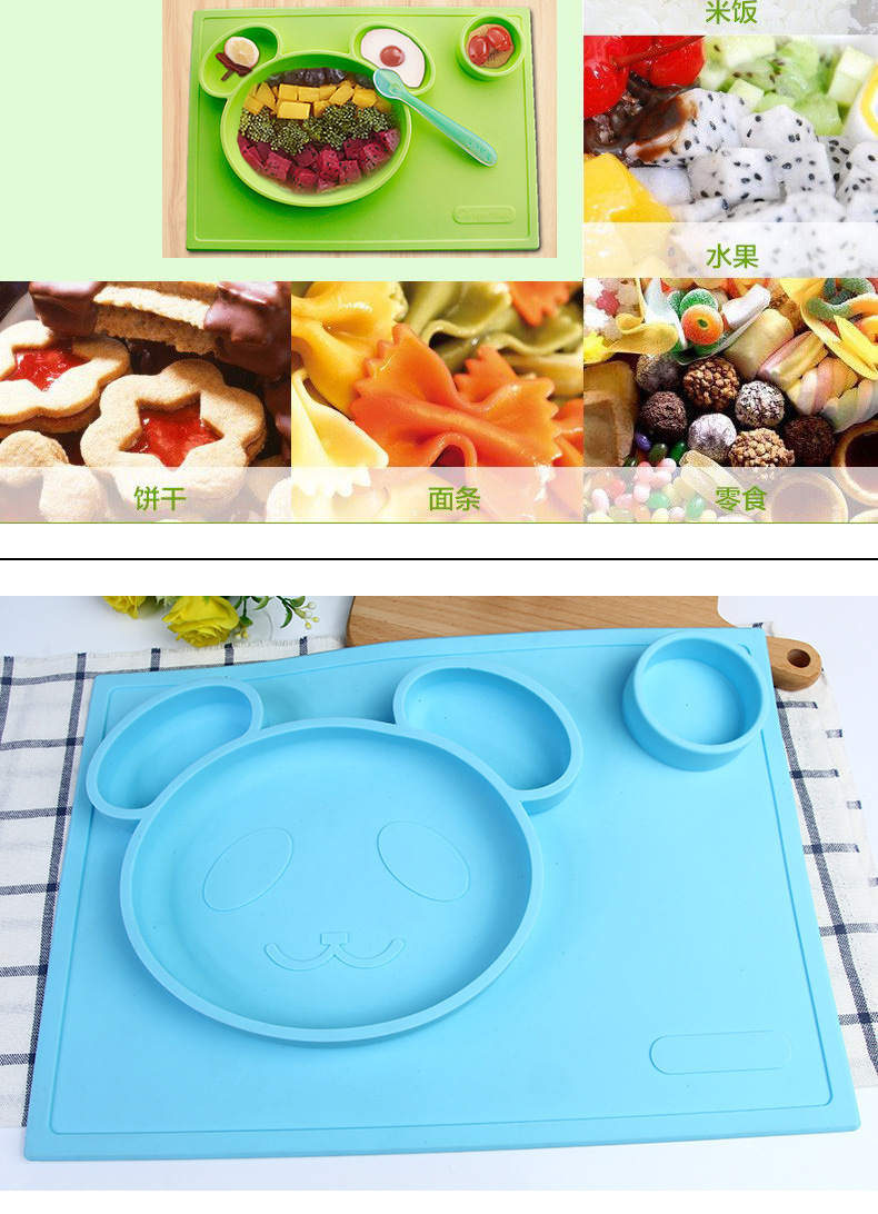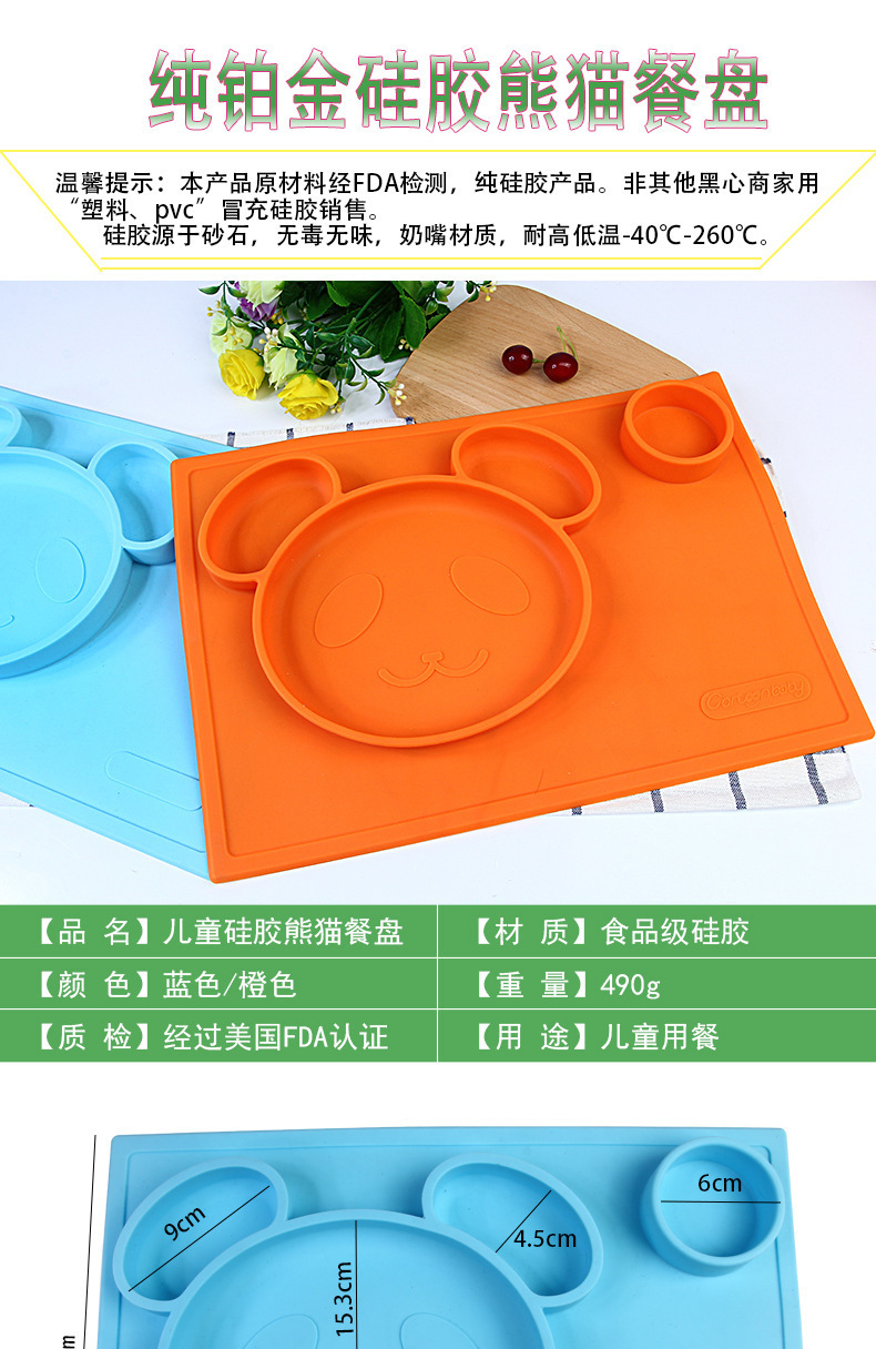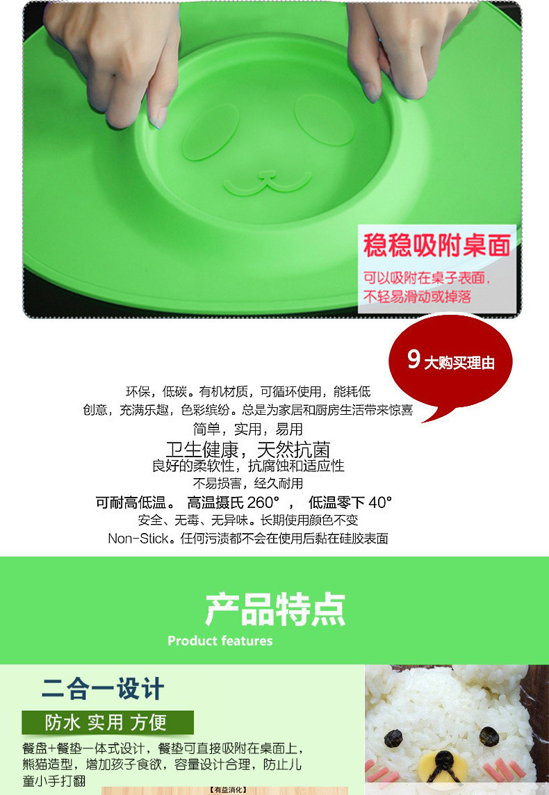 特點:二合一設計,防水、實用、方便,餐盤+餐墊一體式設計,餐墊可直接吸附在桌面上,熊貓造型,增加孩子的食欲,容量設計合理,防止兒童小手打翻。