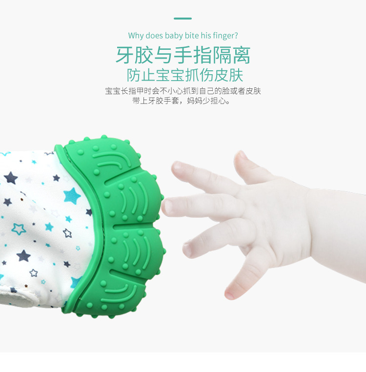 4、常規(guī)牙膠解決不了寶寶咬手指,磨牙手套能較好將手與牙齒隔開(kāi),寶寶啃咬時(shí),既不會(huì)咬到手,還能按摩牙床。