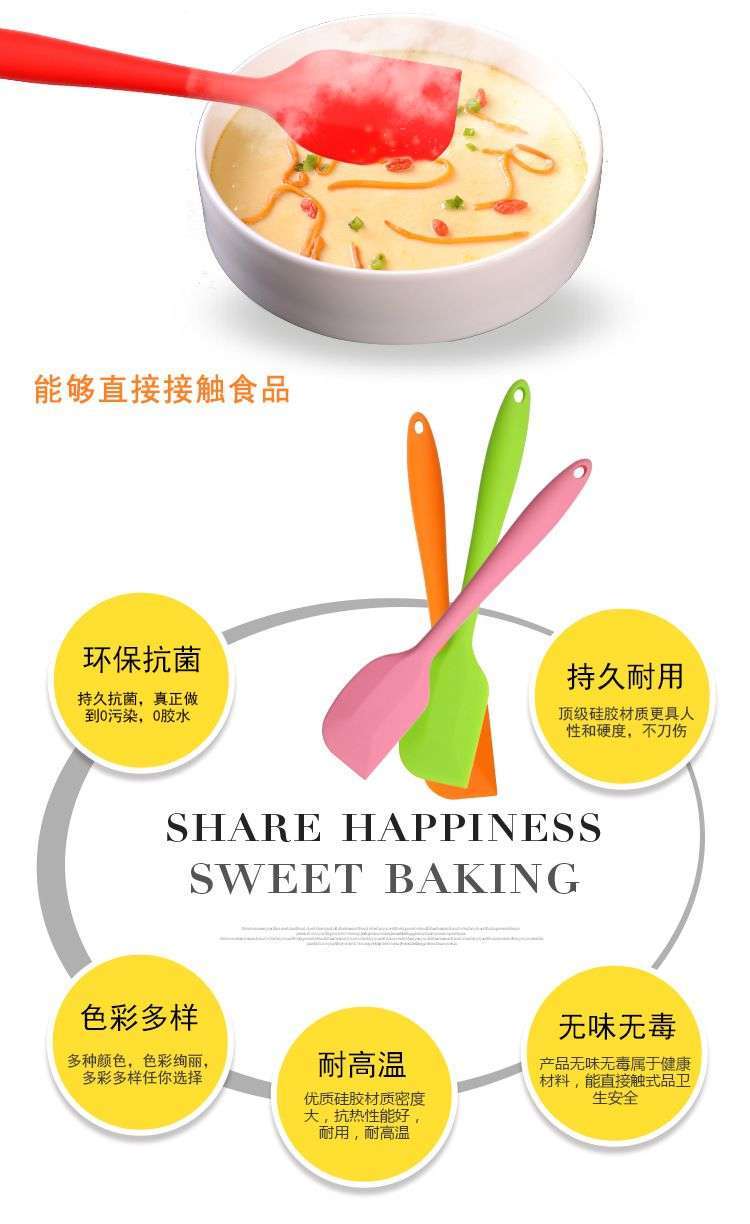 用途:做蛋糕,攪拌蛋白和蛋糕面糊均勻;可有效刮凈攪拌盆表面的殘留面糊、蛋白糊,集中食材并再次利用,減少損耗;抹平倒入模具中的面糊等等;清洗方便用于刮去不沾烤盤、不沾布、鋁合金烤盤等上面的殘渣、碎屑,不會刮傷產(chǎn)品表面。